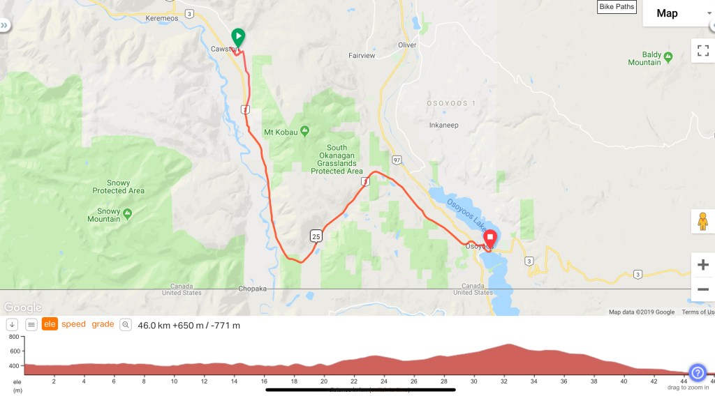 Day 8 Short day to Osoyoos. The Similkaleen Valley is spectacular with river, orchards and mountains. Wondering if the Similkaleen River is navigable in a canoe following Mike and Terese’ wisely chosen path…